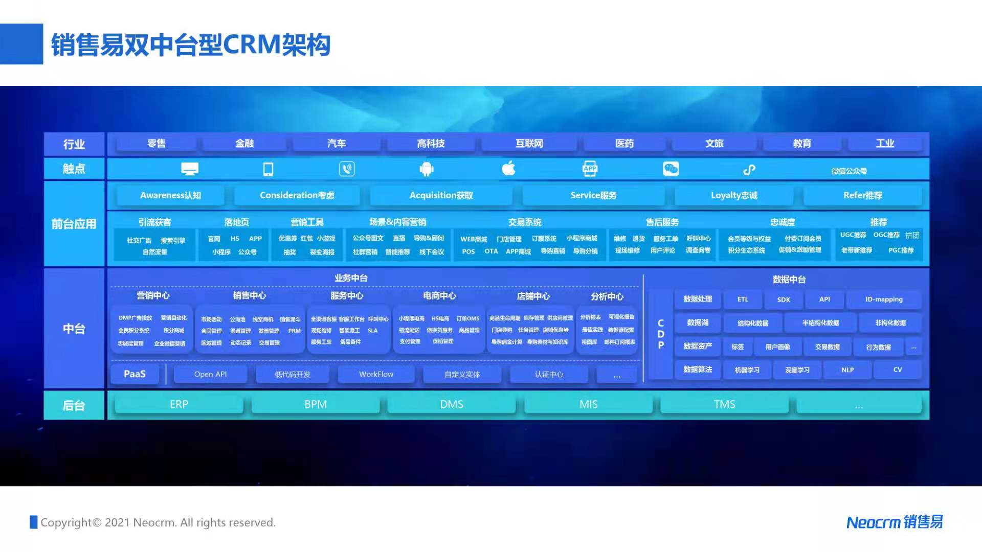 為了更好地踐行B2C戰略,銷售易推出了以CDP為核心的消費者洞察體驗套件和“雙中台型CRM”。