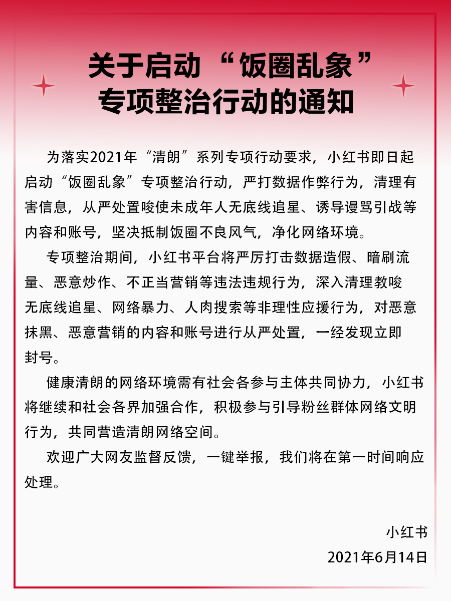 6月14日,小紅書發佈公告,宣佈啓動“飯圈亂象”專項整治行動,嚴厲打擊數據造假、暗刷流量等作弊行為,集中清理惡意炒作、網絡暴力等有害信息,從嚴處置唆使未成年人無底線追星,誘導謾罵引戰等內容和賬號,堅決抵制飯圈不良風氣,淨化網絡環境。