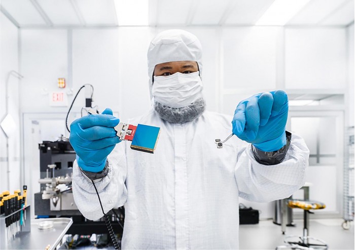 為了製造探測器,加利福尼亞州卡馬裏洛的Teledyne成像傳感器公司的技術人員在探測器的底座上一層一層地建立起光電二極管。然後,他們將探測器固定在一個硅電子板上,該電子板將使用銦幫助處理光信號,這是一種軟金屬,其稠度與口香糖大致相同。每個像素都是用一滴微小的銦來粘住。