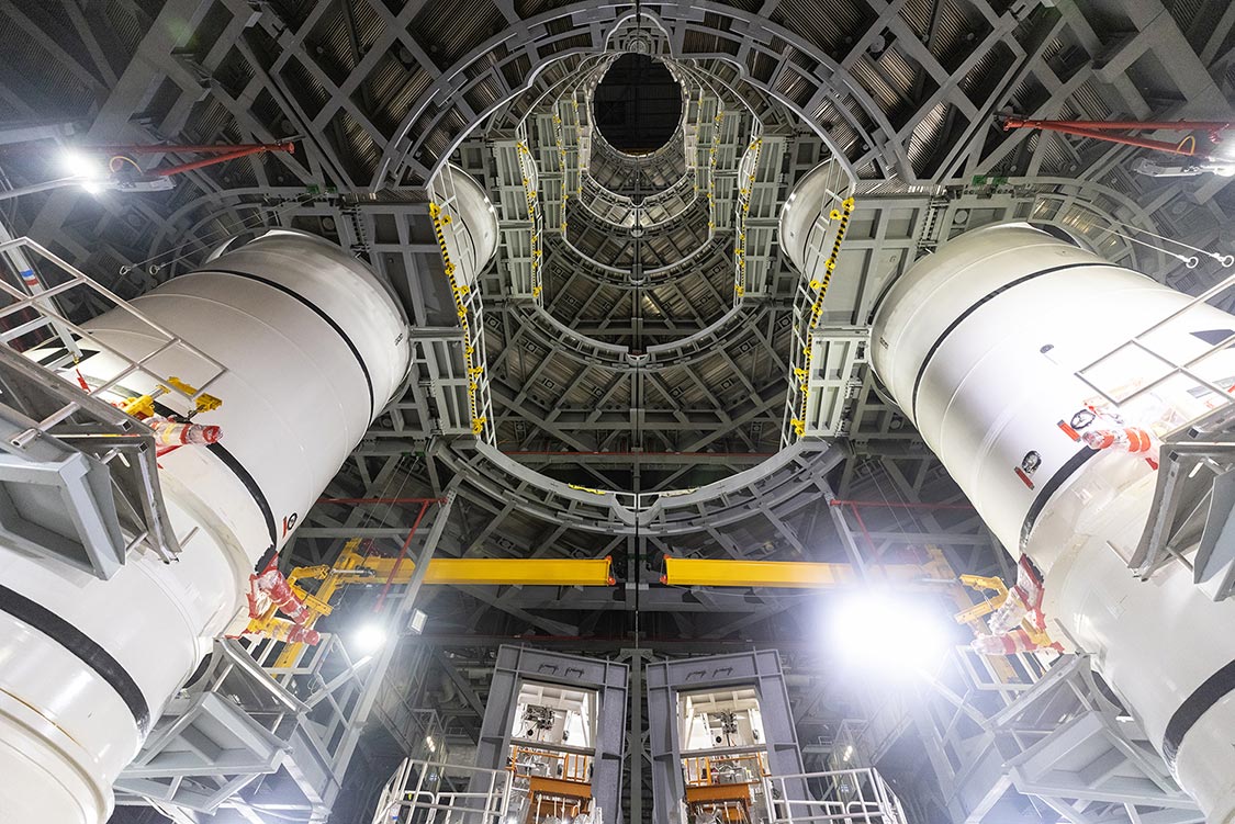 來自太空港探索地面系統和承包商雅各布斯團隊的工作人員目前正準備抬起18.8萬磅的核心級,並將其置於兩個固體火箭助推器之間。團隊將使用一個專門的起重機來提升、放置和固定核心級,並將其放在太空港標誌性的載具裝配大樓(VAB)內的發射器上。