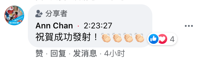 在海峽對岸,不少台灣網友通過“今日海峽”臉書直播收看了神舟十二號載人飛船發射,當看到飛船發射成功,他們也紛紛在直播中留言,表達激動心情。