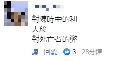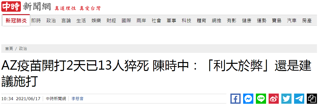 對於陳時中“利大於弊”還是建議接種的説辭,有網友諷刺,“對陳時中的利,大於,對死亡者的弊”。↓