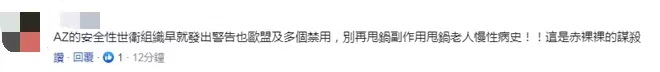 也有網友直斥:AZ(阿斯利康)的安全性世衞組織早就發出警告,歐盟及多國也禁用,別再甩鍋老人慢性病史!這是赤裸裸的謀殺。↓