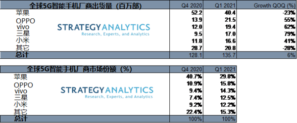 Strategy Analytics總監Ken Hyers表示,全球5G智能手機出貨量環比增長了6%,在2021年第一季度達到了創紀錄的1.36億部。