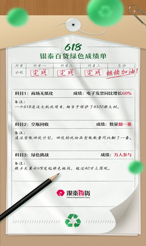 今天正是6月18日,銀泰百貨交出了一份綠色成績單:不到一個月時間裏,電子發票、小票的開取量增長了60%,節約下來的紙張相當於保護了4500棵大樹;通過升級空瓶回收計劃,今年618期間化妝品瓶回收量較去年翻了一番;此外,由銀泰百貨發起的一場綠色行動大挑戰,吸引百萬網友圍觀,更有近萬人曬出自己的低碳行為,迎接挑戰。