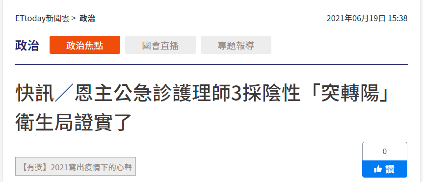 據“ETtoday新聞網”剛剛消息,新北市“衞生局長”陳潤秋19日晚些證實此事,稱該名護理師前三次採檢皆為陰性,但在18日轉陽性,目前急診指出不進,進行淨空、消毒,沒有疑慮才會再重新啓用,並匡列接觸者採檢,予以隔離。