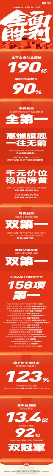 6月19日上午,小米618最終戰報出爐,自6月1日-18日全平台累計支付金額破190億元,再創歷史新高,同比去年增長90%。