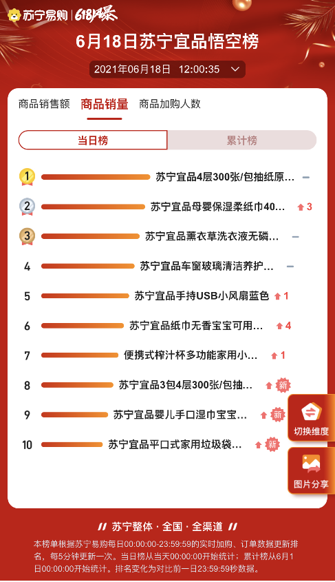 截至6月18日中午12點,蘇寧宜品悟空榜商品銷量前三分別為蘇寧宜品原生木漿衞生紙、蘇寧宜品母嬰保濕柔紙巾和蘇寧宜品薰衣草洗衣液。眼下正值夏天,驅蚊液、手持USB小風扇、防曬冰袖等夏日日常必備物品銷量增多。