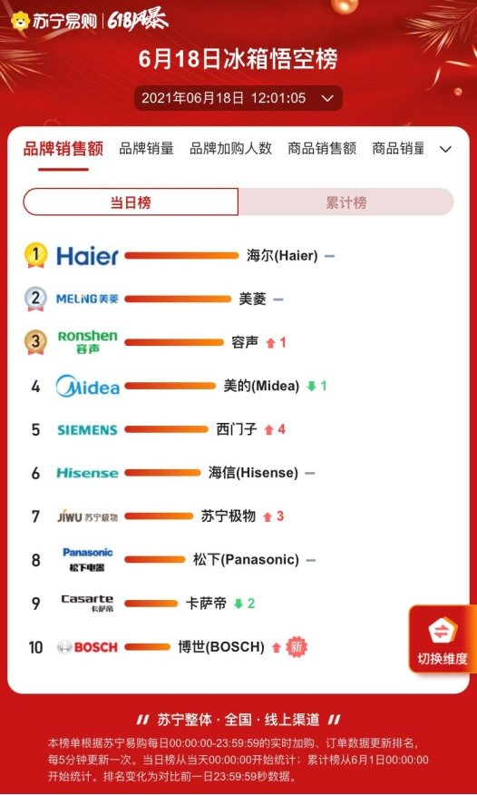 就冰箱悟空榜而言,截至6月18日12點,海爾搶佔份額,稱霸品牌銷售額、品牌銷量、品牌加購人數等多個榜單,暫時超過美菱、美的、容聲。
