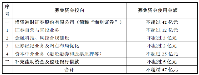 從本次發佈的定向增發股票方案中,也可以看出湘財股份對於未來不同業務條線的佈局戰略,在47億元計劃募集資金使用方面,證券自營與直投業務、證券經紀業務及網點佈局優化、融資融券和股票質押這三項業務線的擬投資金額高達39億元,這也意味着本次湘財股份的再融資,目標直指其核心業務,也是在未來最能夠直接帶來效益的項目。