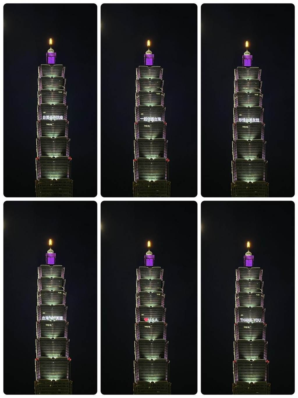 中時新聞網稱,為了感謝美國捐贈台灣250萬劑疫苗,台北101大樓昨日18時30分至22時點燈,打出“台美合作抗疫”、“一起守護台灣”、“珍惜台美友誼”“❤U.S.A.”、“THANK YOU”及“台灣 美國”等六組文字,感謝美國對台灣的關心與支持。