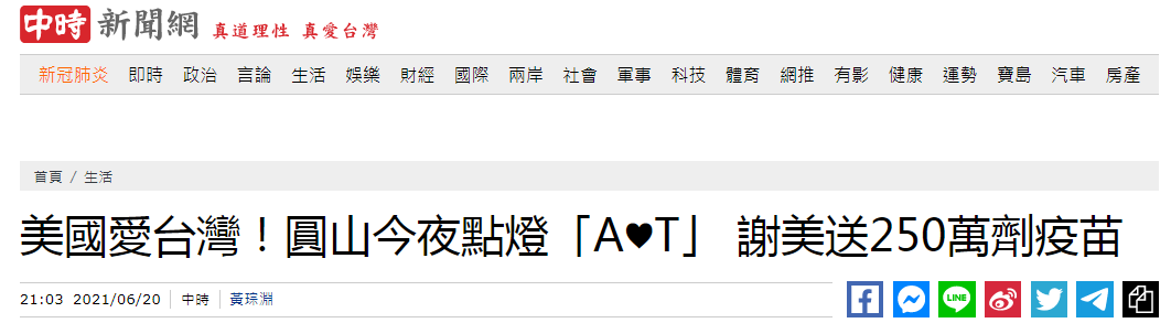報道提及,上回日本贈台124萬劑阿斯利康疫苗後,圓山大飯店本月4日也點上了日文“カンシャ(感謝)”致謝日本。此外,當晚台北101大樓當晚也打字點燈感謝日本提供疫苗,文字包括“合作對抗疫情”“台日友誼長存”、“台灣❤日本”、“攜手前行”、“台日の絆と感謝”等。