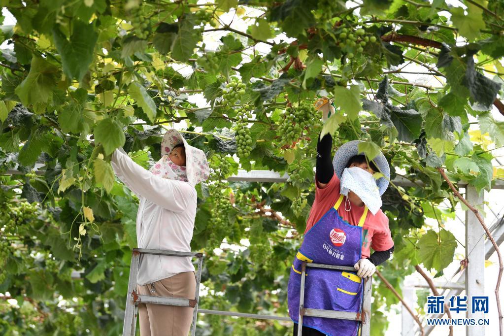 6月20日,在嚴店鄉百果採摘園,農民在修剪葡萄枝葉。