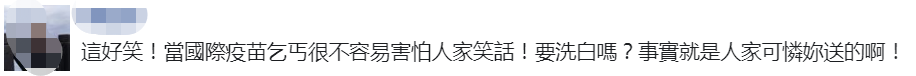 也有網友説,這很好笑!當國際疫苗乞丐很不容易,害怕人家笑話,“事實就是人家可憐你送的啊!”↓