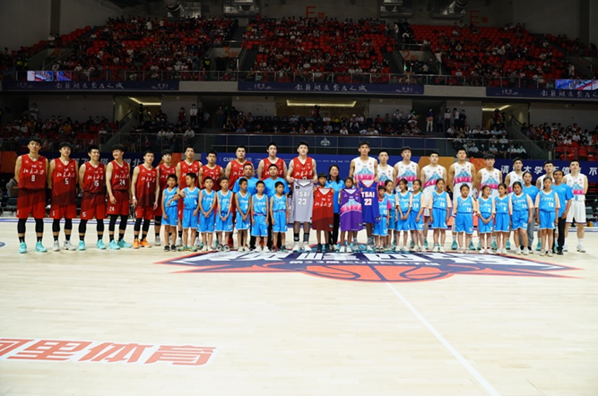 這19名孩子們身穿印有“蔡崇信公益基金會”的球衣登場,在開球前與清華和北大兩隊隊員開心互動。兩位男女生代表與清華北大兩隊隊長交換球衣,所有人共同合影留念。這支CUBA總決賽期間的“第三支球隊”,就是來自貴州省黔東南州黎平縣乜洞小學的三年級小朋友們。