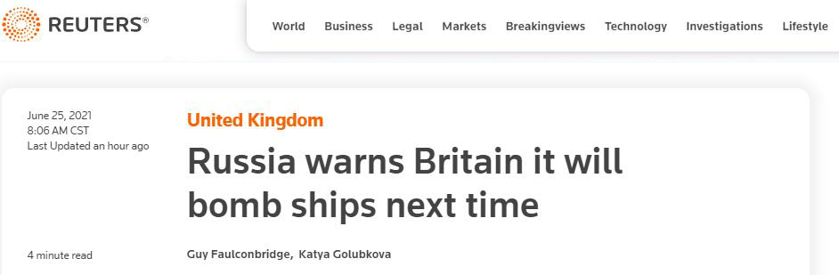 路透社6月24日報道稱,俄羅斯方面當天警告英國,如果英國海軍在克里米亞海岸附近採取進一步的挑釁行動,俄羅斯將對英國軍艦實施轟炸。