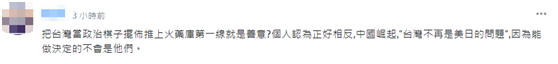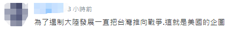 對於這番説辭,有網友直言,“為了遏制大陸發展,一直把台灣推向戰爭,這就是美國的企圖。”“把台灣當政治棋子擺佈推上火藥庫第一線就是善意?個人認為正好相反,中國崛起,‘台灣不再是美日的問題’,因為能做決定的不會是他們。”