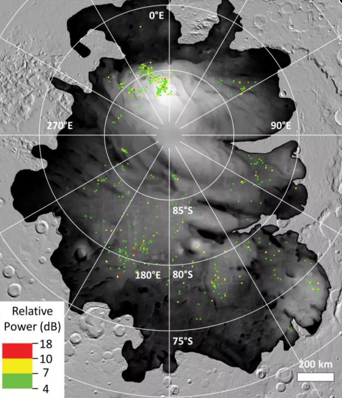 研究人員根據明亮的雷達反射創建了一張地圖,顯示可能的地下湖泊位置。他們還不準備宣佈是什麼導致了這些信號,這給我們留下了一個持續的謎團。火星的南極是否有地下湖,或者那裏發生了其他事情?