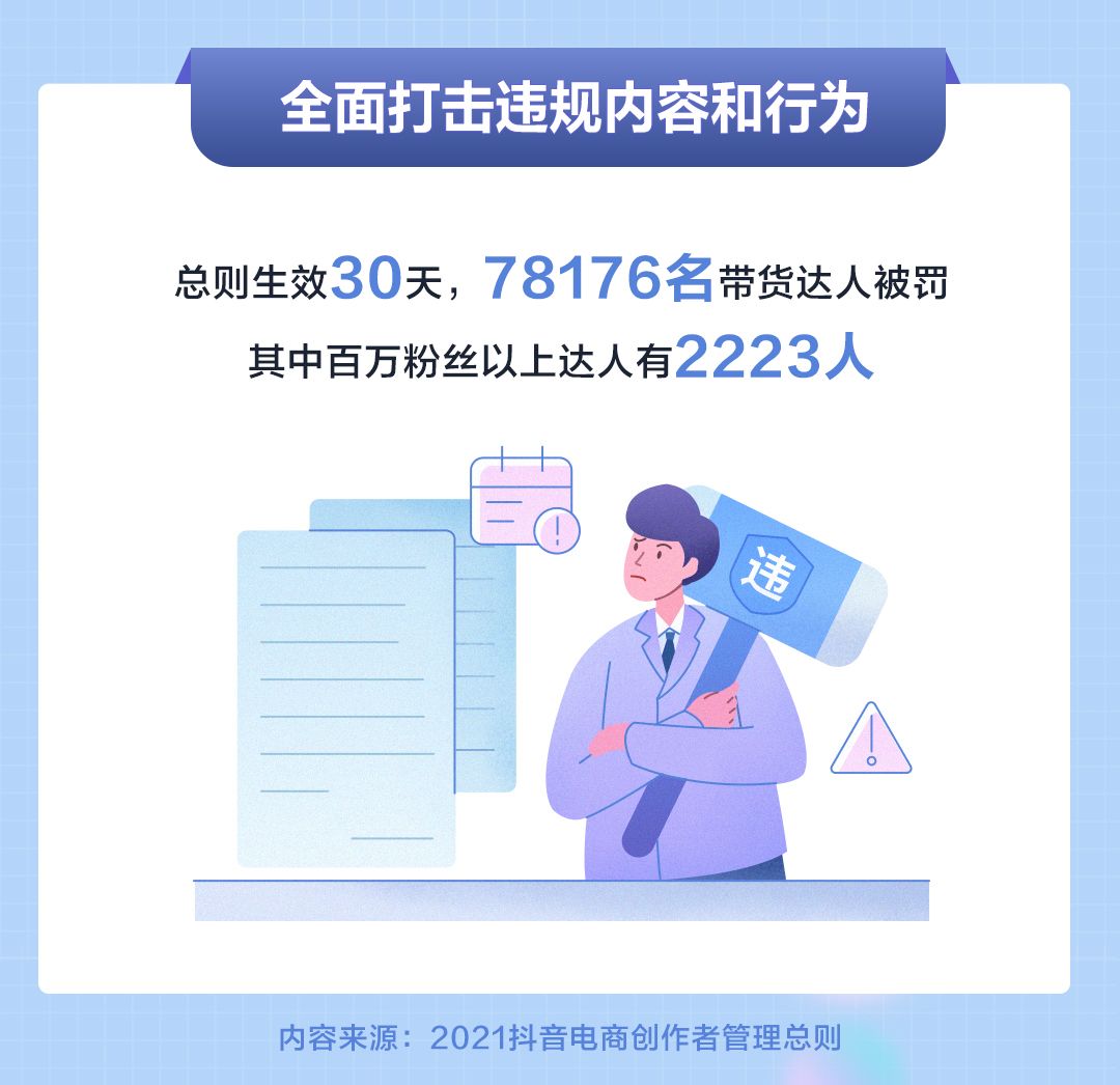 6月25日,抖音電商公佈《電商創作者管理總則》(下稱總則)階段治理成果,有78176名帶貨達人因違規被平台判罰,其中百萬粉絲以上的達人有2223人。