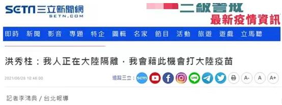 報道最後提到,洪秀柱表示,有些朋友關心她會不會在大陸接種疫苗,“當然,我會藉此機會在大陸接種通過WHO認證的疫苗,我對大陸的疫苗質量也有信心。希望台灣的疫情能夠儘快獲得有效的控制,也祝福大家健康、平安”。