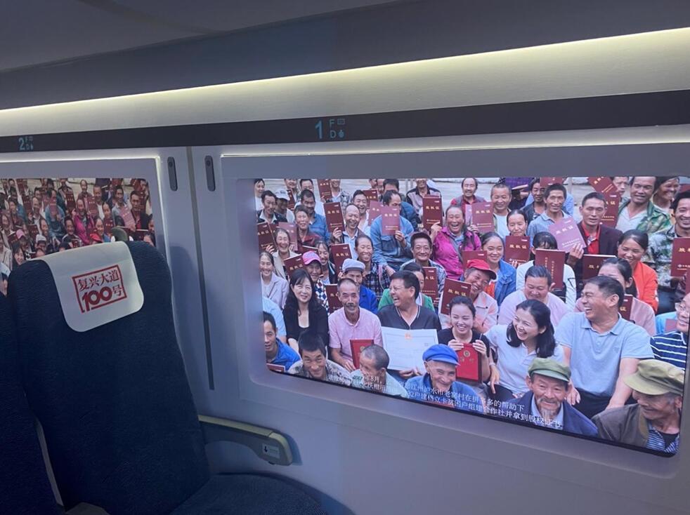 在列車車窗上,閃動着一個個中國夢的經典瞬間——山東艦首航、大興機場落成……眾多畫面中,一張洋溢着巨大歡快感的村民集體照撲面而來,照片定格的是2019年9月5日雲南怒江傈僳族自治州瀘水市老窩鎮老窩村132户建檔立卡户領到助農合作社股權證的那一天。
