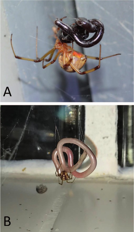 在美國常見的Theridiidae家族的“黑寡婦”蜘蛛特別擅長捕捉和吃掉蛇,這可能與蜘蛛的強效毒液和堅固的蜘蛛網有關。許多捕食蛇的蜘蛛的毒液也會對人類造成危險。