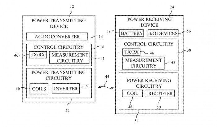 蘋果專利提到了它所謂的"負載線”,或特定的"無線電力傳輸設備中的逆變電路"。該墊子能夠檢測到設備何時被放在上面,並使用最近的充電線圈為其供電。當比較電流和電壓測量值偏離預期的負載線超過一個閾值時,就可以檢測到設備的移動,當檢測到移動時,可以採取適當的行動。例如,控制電路可以使用線圈電感測量電路來收集最新的線圈電感測量值,通過分析線圈電感測量值,控制電路可以確定哪些線圈在接收裝置傳輸無線電力時要切換使用。