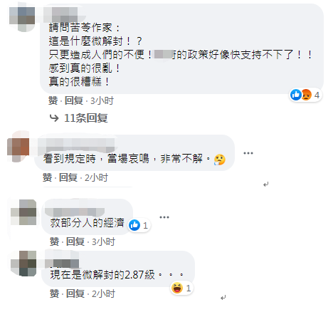 報道稱,有許多島內網友在苦苓的臉書帖文下留言回應,並質疑民進黨當局的所謂“微解封”的政策,“這是什麼微解封!?只更造成人們的不便!‘政府’的政策好像快支持不下了,感到真的很亂,真的很糟糕。”“看到規定時,當場哀鳴,非常不解。”“我真的聽不懂‘政府’在説啥?”“這個微開放的政策,我也感覺很疑惑。”“救部分人的經濟。”“車內不算是室內?”