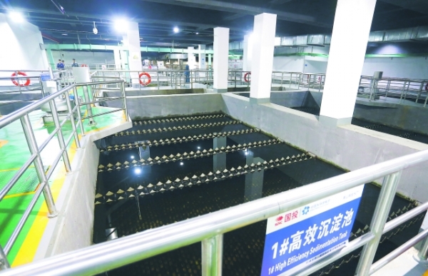 工人在觀山湖區金陽三期再生水廠二沉池安裝調試鏈式刮泥刮渣機等設備。