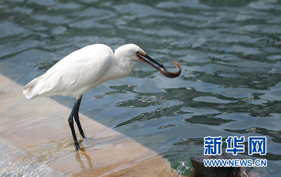 7月10日,一隻白鷺在南明河上捕食。新華網 盧志佳 攝
