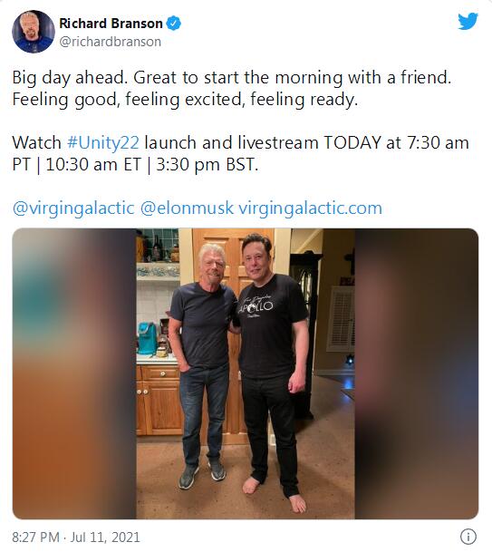 *【環球網智能綜合報道】*7月11日晚8時許,剛從太空旅行歸來的維珍銀河創始人理查德•布蘭森通過社交平台曝光一張與埃隆•馬斯克在出發前拍下的合影,並配文稱“和朋友一起開始新的一天真是太好了,感覺準備好了”,引發網友關注。