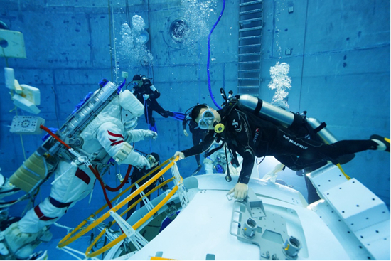 在水深10米、直徑23米的巨大水槽中,空間站水下訓練模型如同一個龐然大物,靜靜卧在水底。
