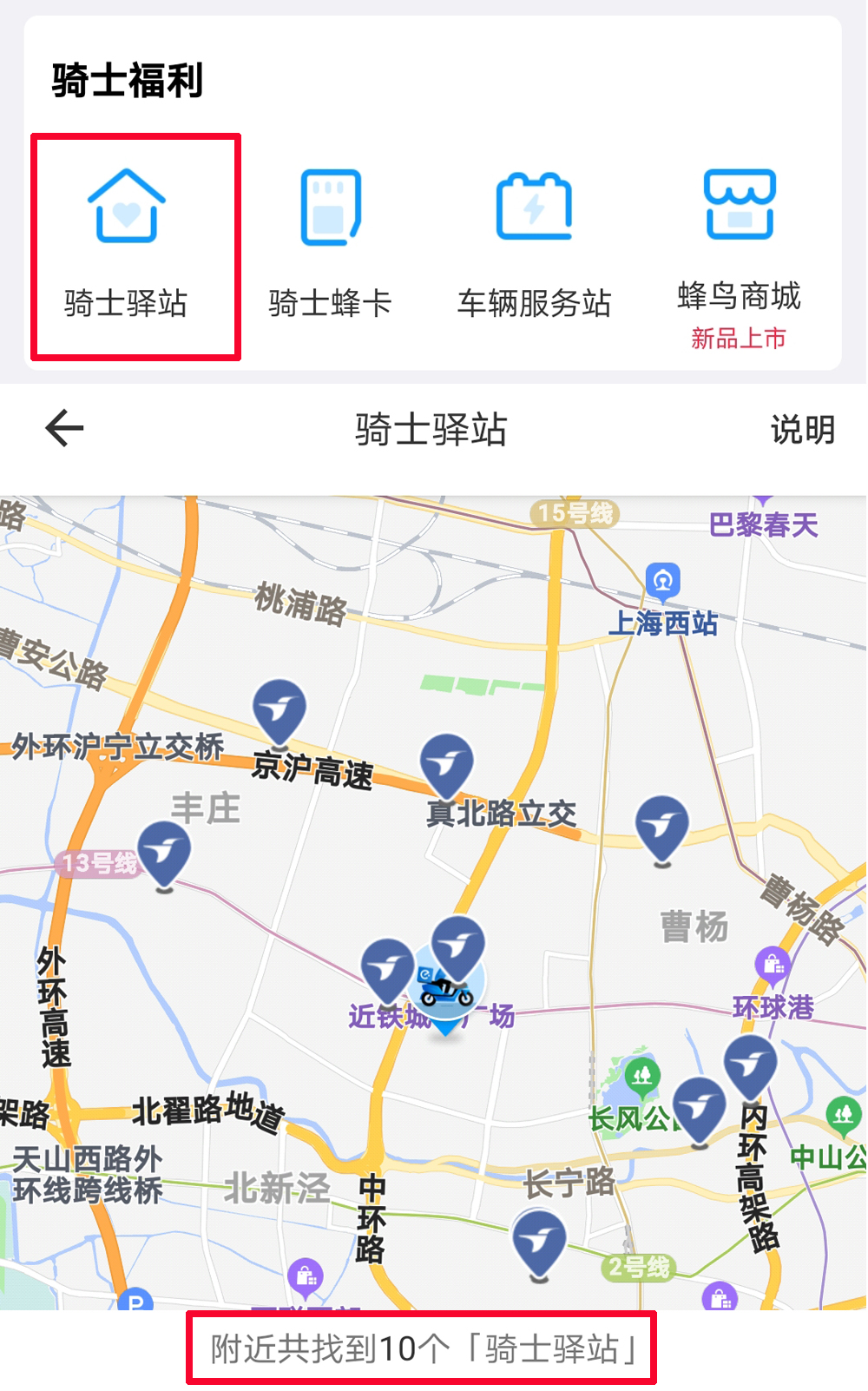 為了讓穿行在大街小巷的騎手有個遮陽、避雨的地方,餓了麼聯合全國總工會、全國商家建立藍騎士驛站,開闢專屬區域供騎手歇腳,有的驛站還提供免費飲品、優惠餐食、手機充電等服務,目前驛站已向所有户外工作者開放。騎士在接單APP後台可以查找附近藍騎士驛站,並前往休息。
