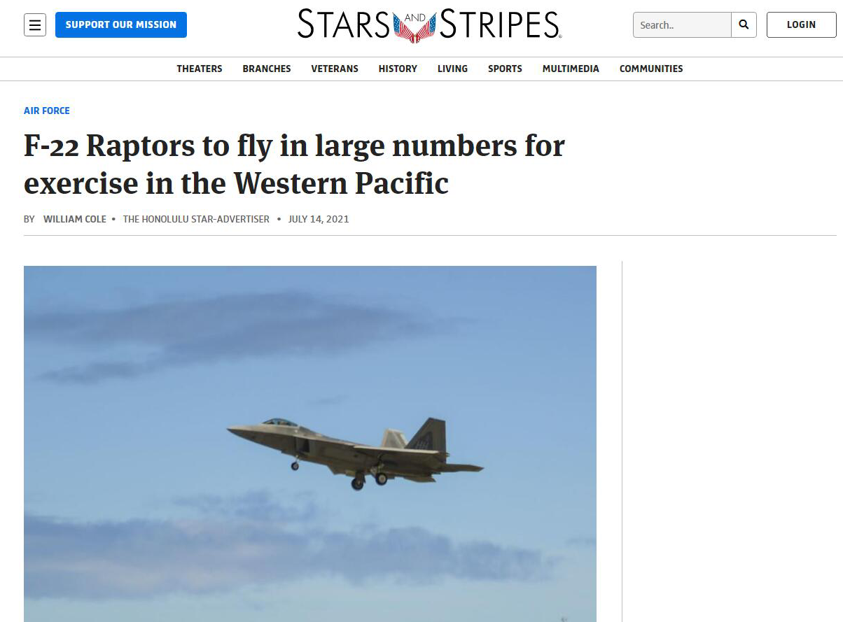 美國《星條旗報》網站7月14日報道稱,美國夏威夷空軍國民警衞隊正在將多架F-22戰鬥機部署到在西太平洋地區舉行的演習中。參與演習的包括大約25架來自夏威夷和阿拉斯加的隱形戰鬥機。報道還稱,這些戰鬥機是在與中國發生任何可能的衝突時“打開大門”的關鍵。