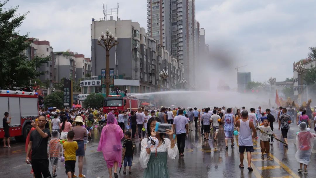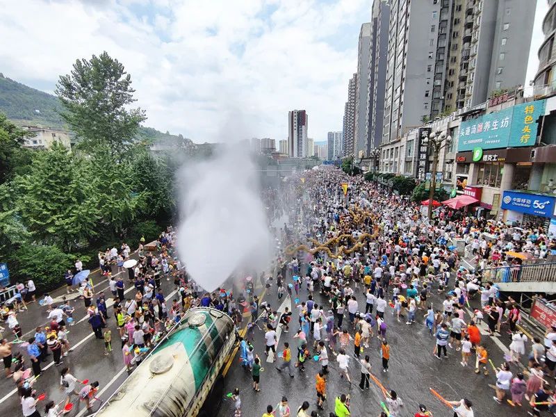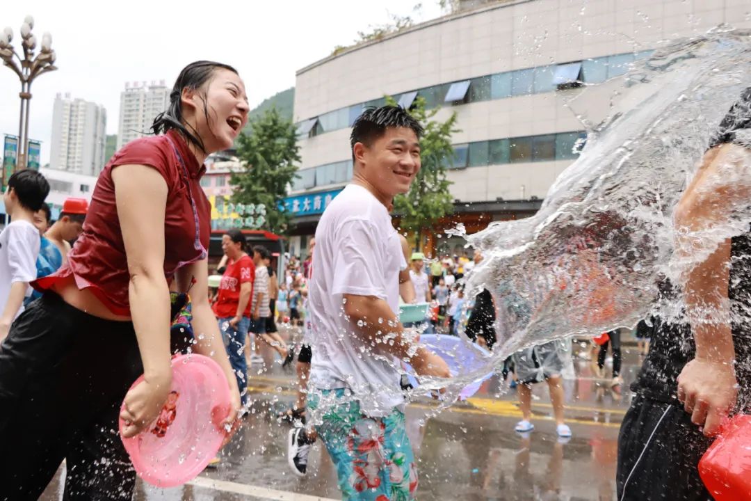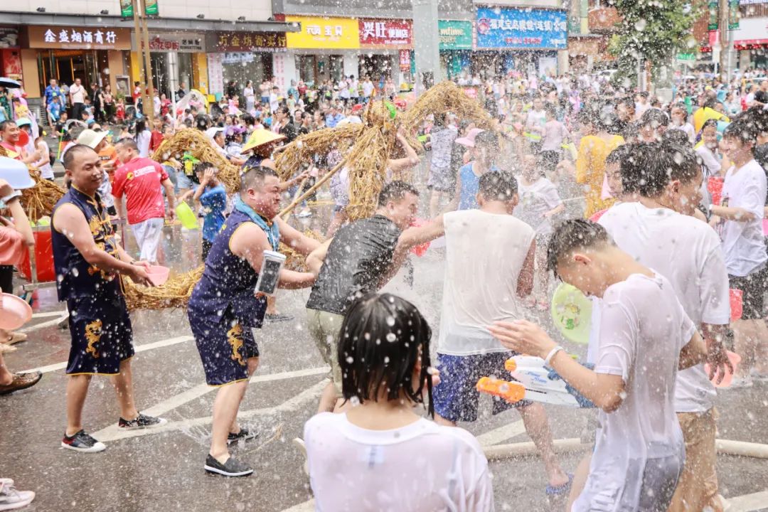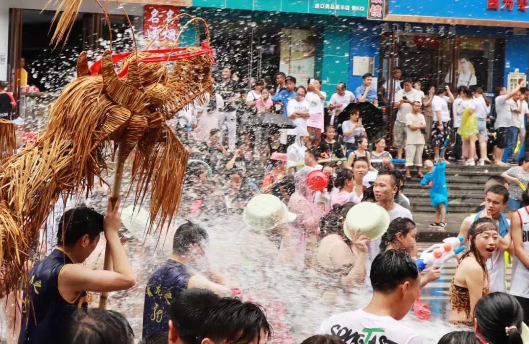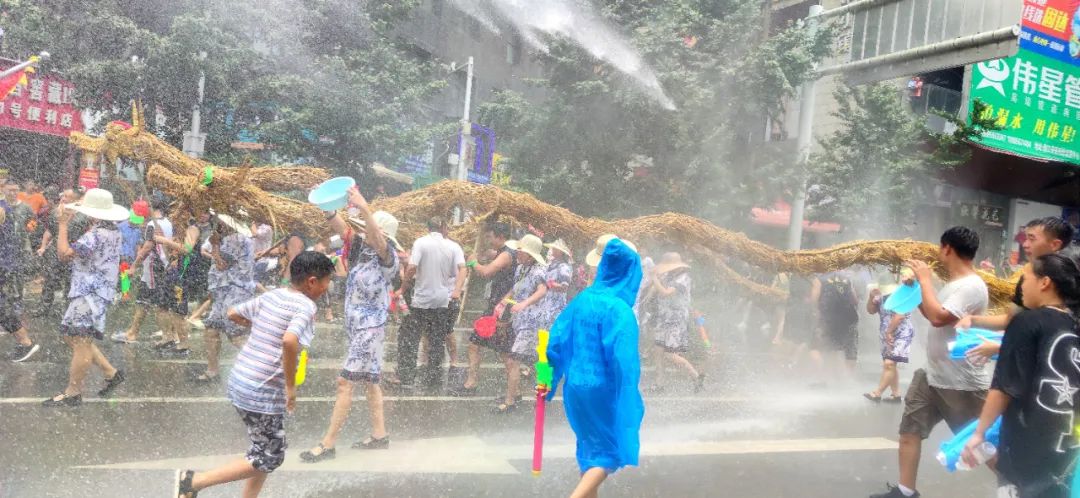 出龍儀式後,來自德江縣城各街道、社區的30多條水龍走上街頭接受廣大市民遊客的“洗禮”。市民和遊客們水瓢、水盆、水槍齊上陣,水來得越猛烈,龍舞得越矯健,廣大羣眾與龍共舞,城區處處是龍的英姿、人的笑語,現場氛圍十分熱烈。