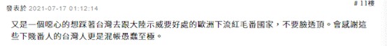 也有網友説,“又是一個噁心的想踩着台灣去跟大陸示威要好處的歐洲下流國家”,“會感謝這些人的台灣人更是愚蠢至極”。