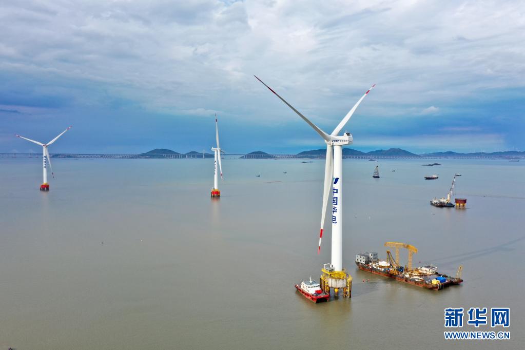 這是華電福清海壇海峽海上風電項目首台海上風電主控系統國產化機組(右)(5月28日攝,無人機照片)。新華社記者 姜克紅 攝