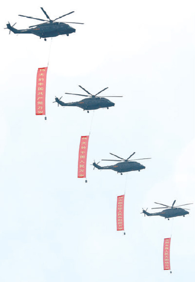 表演伊始,由7架直升機組成的空中護旗梯隊懸掛黨旗和四面巨幅標語,率先通過天安門廣場上空。四幅標語上分別寫着“偉大的中國共產黨萬歲”“偉大的中國人民萬歲”“偉大的中華人民共和國萬歲”“全國各族人民大團結萬歲”。