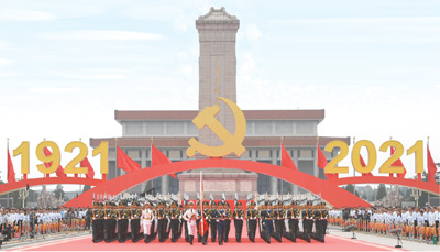 7月1日,來自中國人民解放軍的71架戰機飛過天安門廣場,向黨送上生日祝福;100響禮炮響徹雲霄,鮮豔的五星紅旗在國旗護衞隊的護送下,行進至廣場北側的升旗區;聯合軍樂團奏響雄壯的《義勇軍進行曲》,鮮豔奪目的五星紅旗冉冉升起、迎風飄揚……盛典上,來自不同部隊的官兵展現了一心向黨、矢志強軍的精神風貌,為黨的百年華誕深情禮讚。