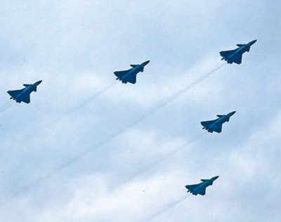 15架殲—20飛機分成3個5機中隊呼嘯入場,把飛行表演推向高潮。殲—20飛機是我國自主研製的新一代隱身戰鬥機,如此大規模的殲—20編隊飛越天安門廣場尚屬首次。