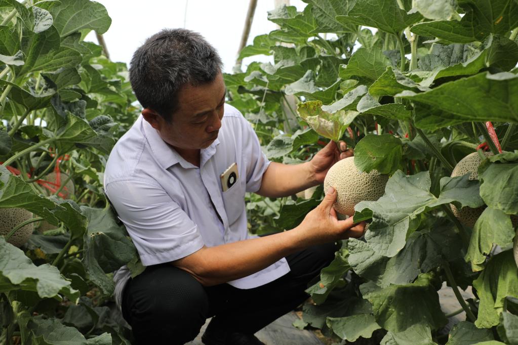 齊少坤在大棚裏查看網紋瓜長勢(採訪對象供圖)