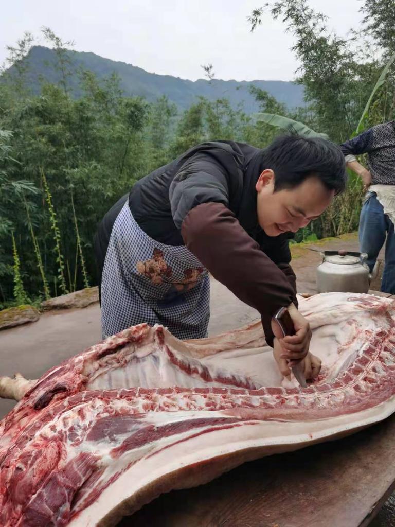 祁登益正在切土豬肉(採訪對象供圖)