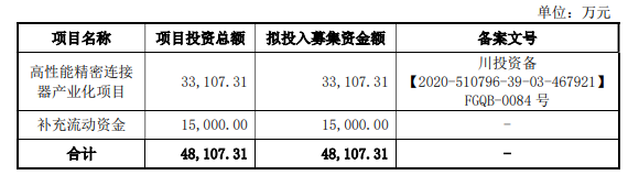 本次公開發行不超過 2,700 萬股,募集資金48,107.31萬元用於高性能精密連接器產業化項目和補充流動資金。具體如下: