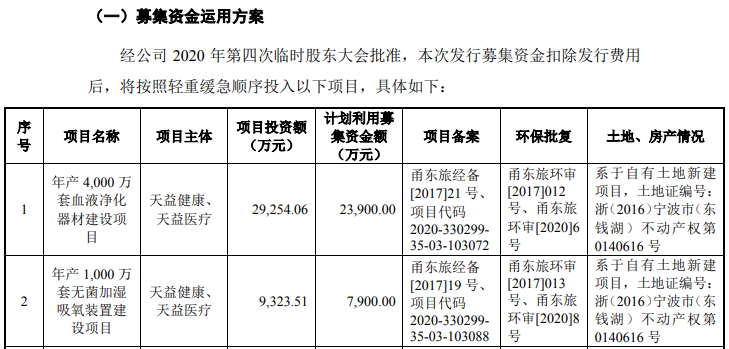 其次,根據招股書披露,天益醫療本次上市的募投項目主要包括“年產4000萬套血液淨化器材建設項目”和“年產1000萬套無菌加濕吸氧裝置建設項目”等,其中“年產1000萬套無菌加濕吸氧裝置建設項目”涉及計劃利用募集資金額僅為7900萬元。上述兩個項目獲得項目備案、環保批覆均是在2017年,相關項目所需土地也均於2016年獲得。