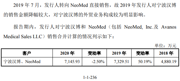 另據招股書第236頁披露,天益醫療在2020年向寧波漢博、NeoMed合計銷售7145.93萬元,而招股書第234頁則披露NeoMed作為第一大客户,在2020年向天益醫療採購了6998.95萬元,這也就意味着天益醫療在2020年仍然通過寧波漢博向NeoMed間接銷售了上百萬元,這也與“eoMed於 2019年7月改為直接向發行人採購”的信息披露不符。