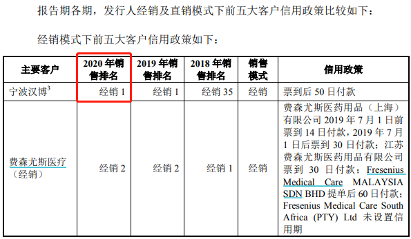 不僅如此,根據招股書披露,“寧波漢博國際貿易有限公司”原本是天益醫療重要經銷商,招股書第123頁披露,該經銷商在2020年的經銷金額排名第一,天益醫療通過該經銷商向NeoMed、Synecco等終端客户進行銷售。但與此同時,招股書頁披露NeoMed於 2019年7月改為直接向天益醫療採購, Synecco也 自2020年5月起與公司直接進行採購,原經由寧波漢博與公司開展的購銷業務自此結束。在此背景下,“寧波漢博國際貿易有限公司”仍然被列為天益醫療2020年銷售排名第一位的經銷客户,並不符合正常邏輯。