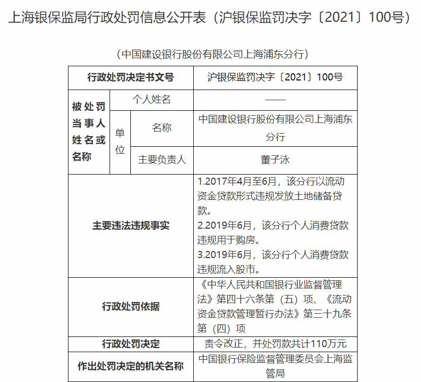 建設銀行七家支行、一家分行被罰,罰款金額共計410萬元。其中,建設銀行浦東分行涉及三項違法違規,被罰金額最大,共計110萬元。