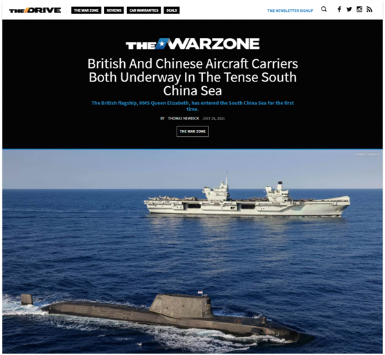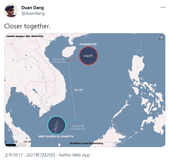 美國“動力”網站“戰區”專欄7月29日報道稱,一張最新曝光的衞星圖顯示,英國“伊麗莎白女王”號航母編隊正在南海,而解放軍的航母山東艦也在同一海域活動。