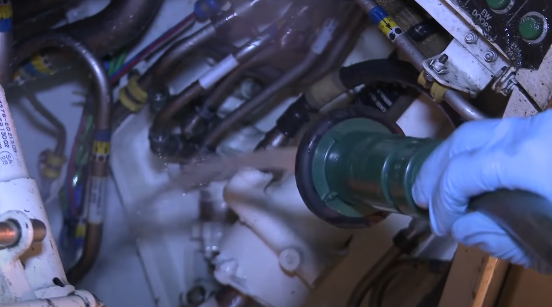 美軍士兵清洗維護F-22戰鬥機,直接用水管對着起落架艙室噴水沖洗。
