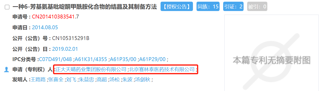 根據招股書第154頁披露的境內專利信息,專利權人為首藥控股的恰恰為5項,其餘則是歸屬於子公司賽林泰,或是由首藥控股與正大天晴、潤眾製藥等共同擁有。但是根據國家知識產權局檢索發現,專利權人為首藥控股的專利“作為FAK/Pyk2抑制劑的2,4-二氨基-6,7-二氫-5H-吡咯並[2,3]嘧啶衍生物”,其申請人為子公司賽林泰,而且該項專利的授權公告發布日是在2016年9月。